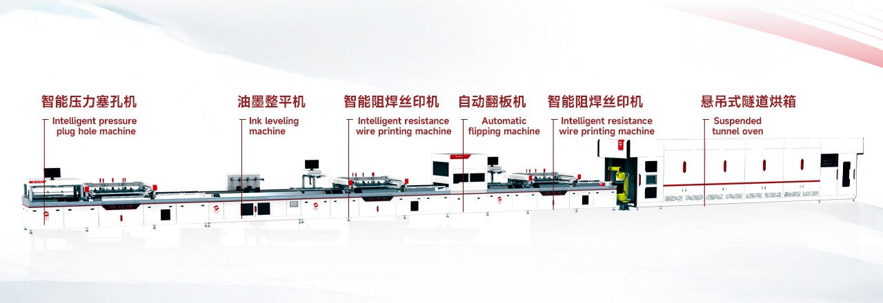 全自動特大板阻焊絲印烘干生產線解決方案,主要由特大尺寸pcb板,智能油墨樹脂塞孔機、自動阻焊絲網印刷機、阻焊預烤絲印烘干懸吊式隧道爐組成,實現3道工藝制程全自動生產,可節省人工6-8人,分鐘產能高達3~5片,節能省電智能高效。